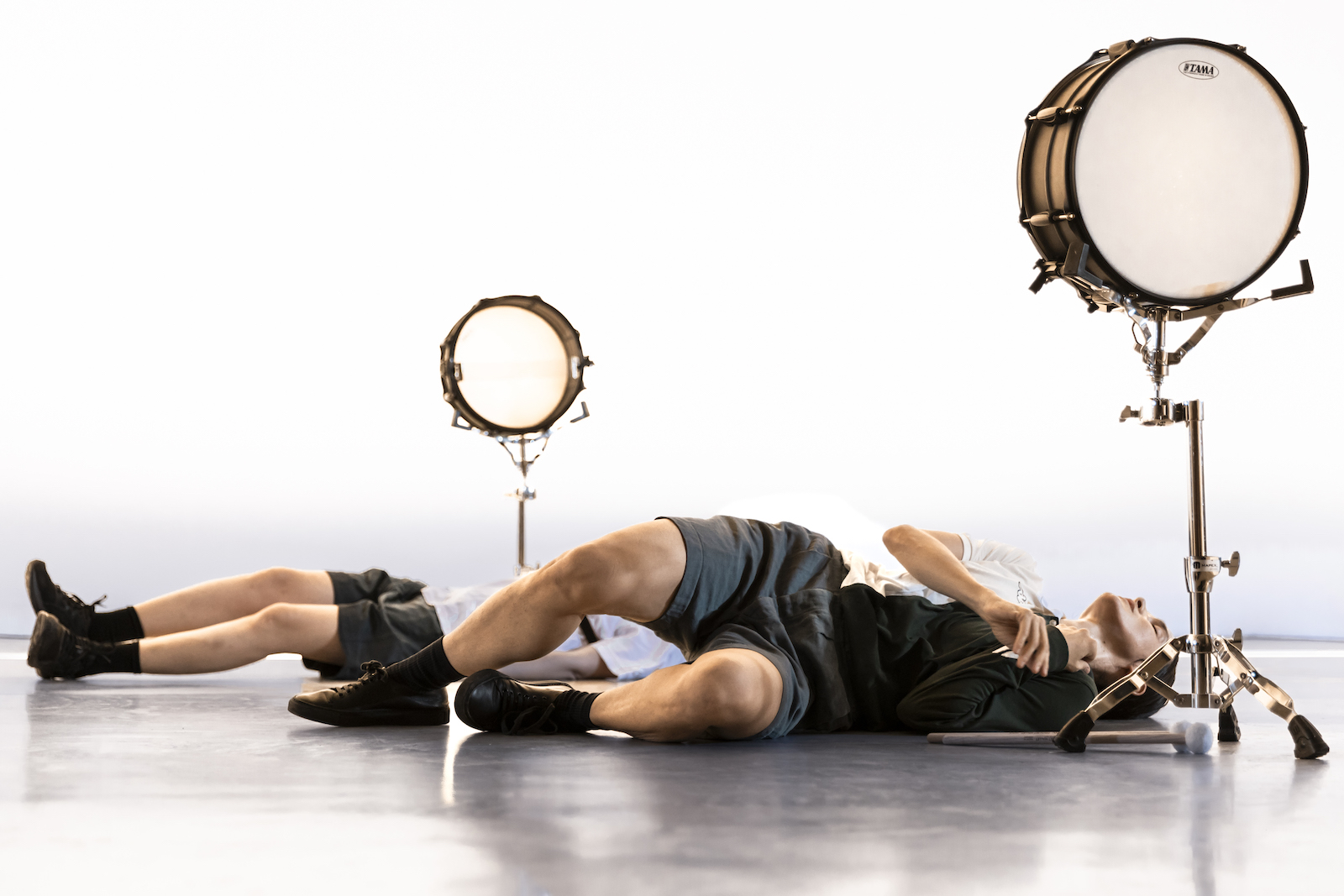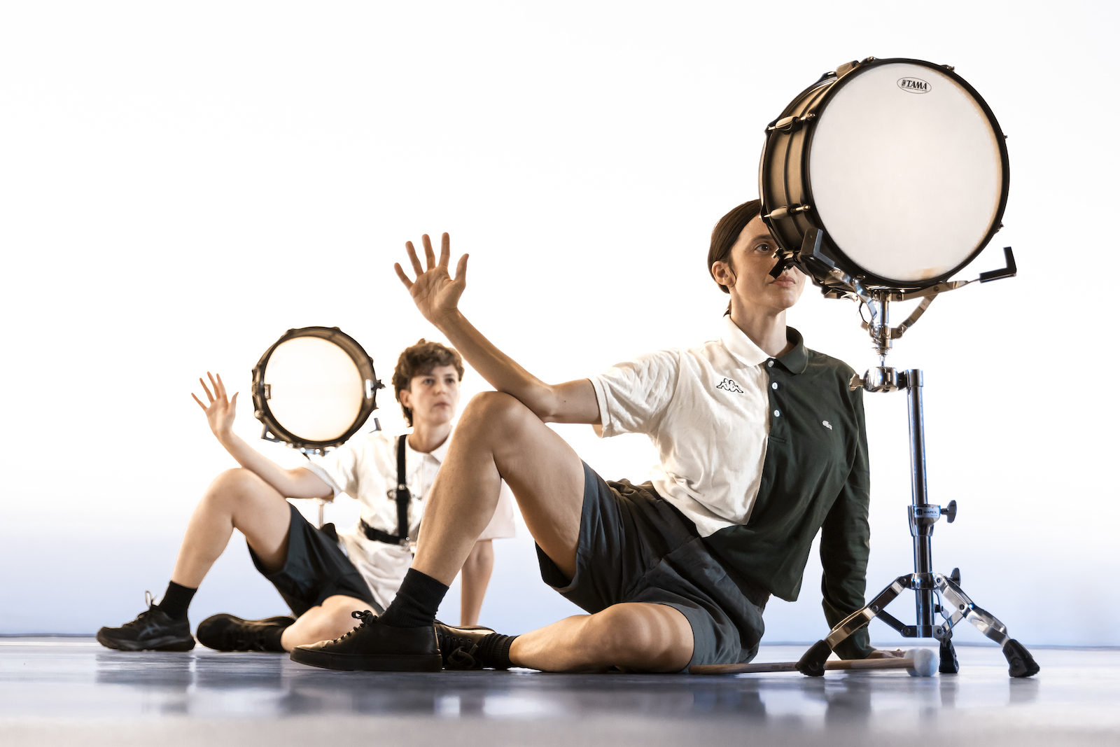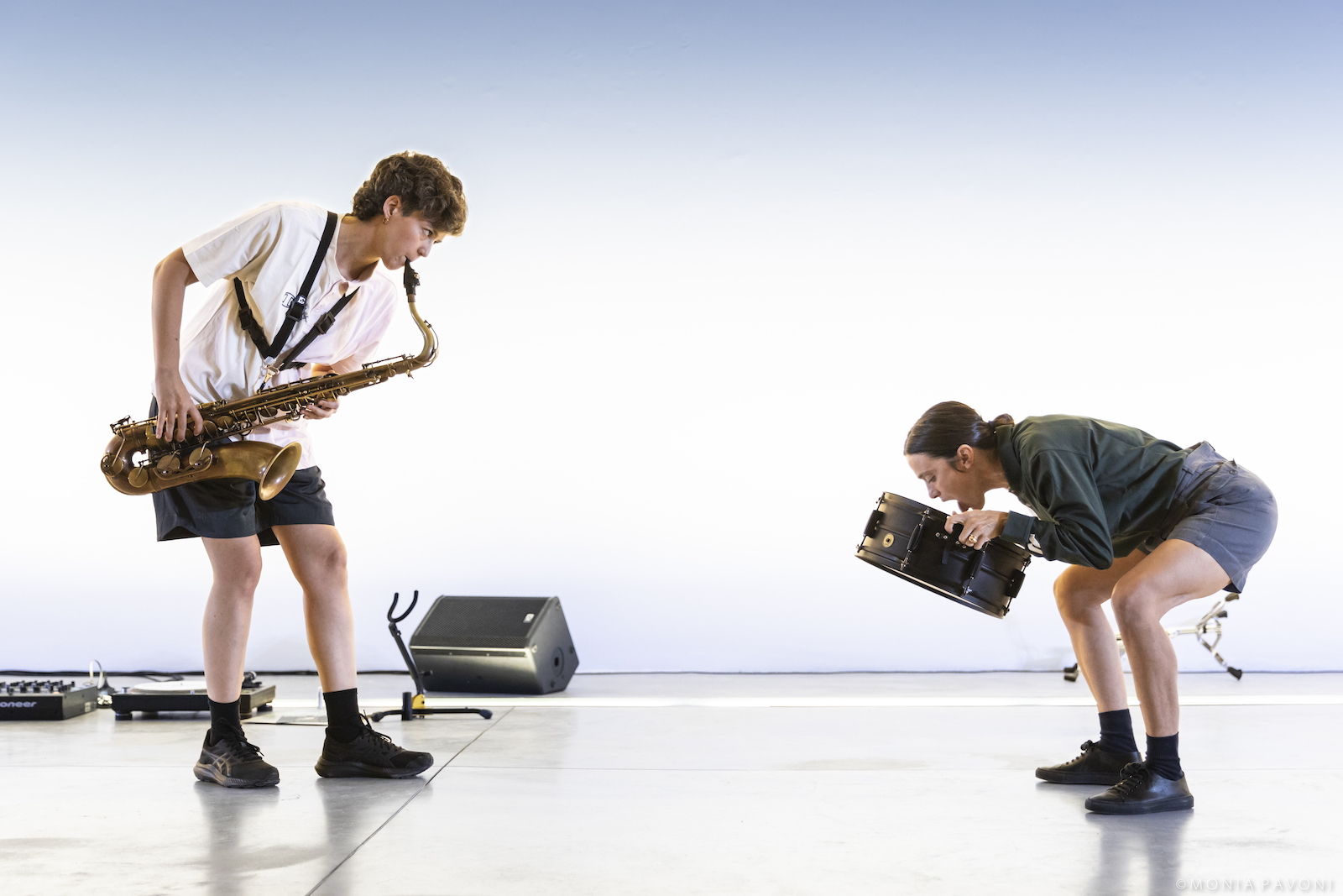 BLEAH!!! returns to bodies and their objects. It disarticulates the typical performative roles of dancer and musician and designs a landscape to be created together, with the common channel of breath and objects. Ajmone and Agnusdei plan a script that disregards and redistributes the authorial functions. Dance plays and music dances; sound choreographs space, while movement accompanies it, reshapes it, and multiplies it. Volume and gestures of the saxophone and the body, of breaths and drums create unique acoustic areas of encounter and relationship, that vary in architecture and temperature, evoking poetry and emotion.